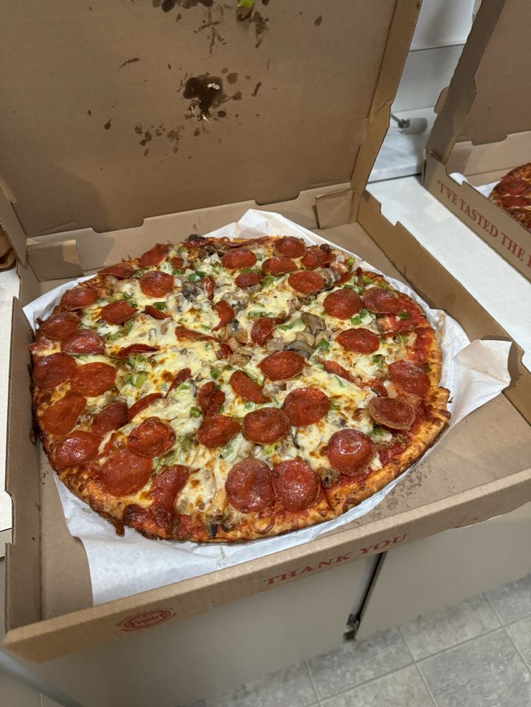 Pepperoni, sausage, green peppers, onions and mushrooms